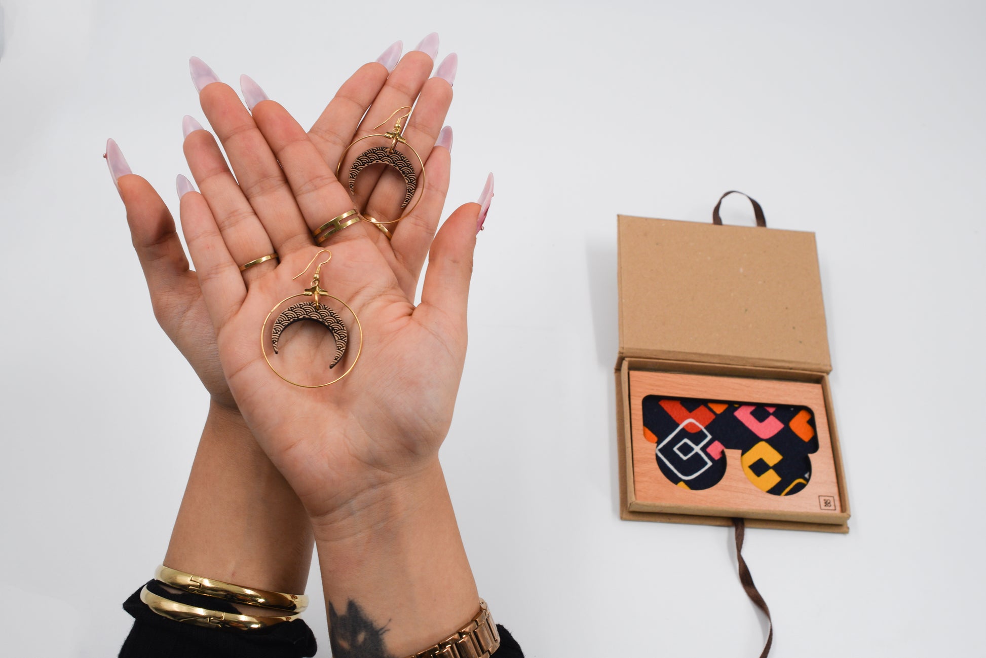 Boucles d’Oreilles Dorées en Lune avec Coffret en Bois