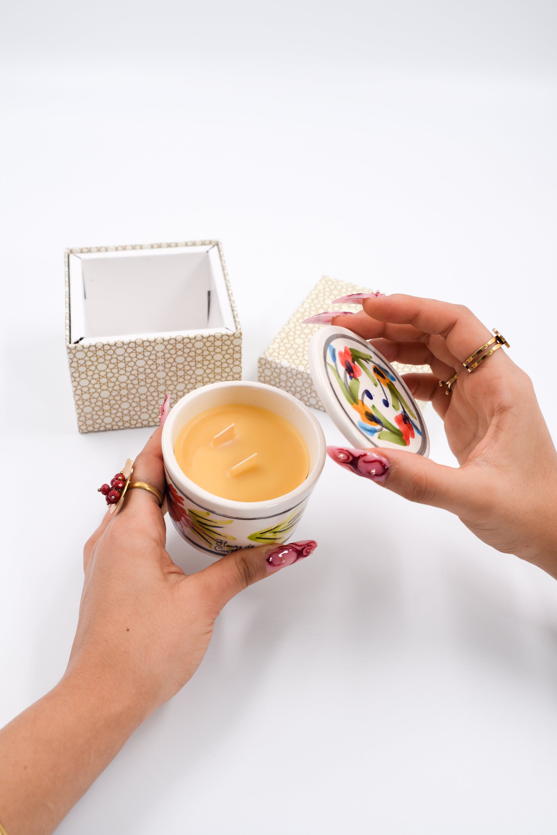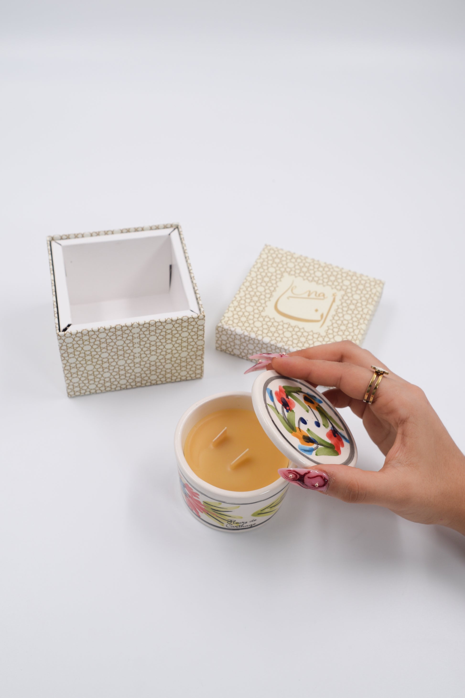 Coulée dans un pot en céramique peint à la main, chaque pièce est unique et reflète le savoir-faire tunisien. Son parfum délicat et floral évoque les jardins de Carthage, créant une atmosphère apaisante et raffinée. Un produit à la fois décoratif et authentique, idéal pour offrir ou pour sublimer vos moments de détente.