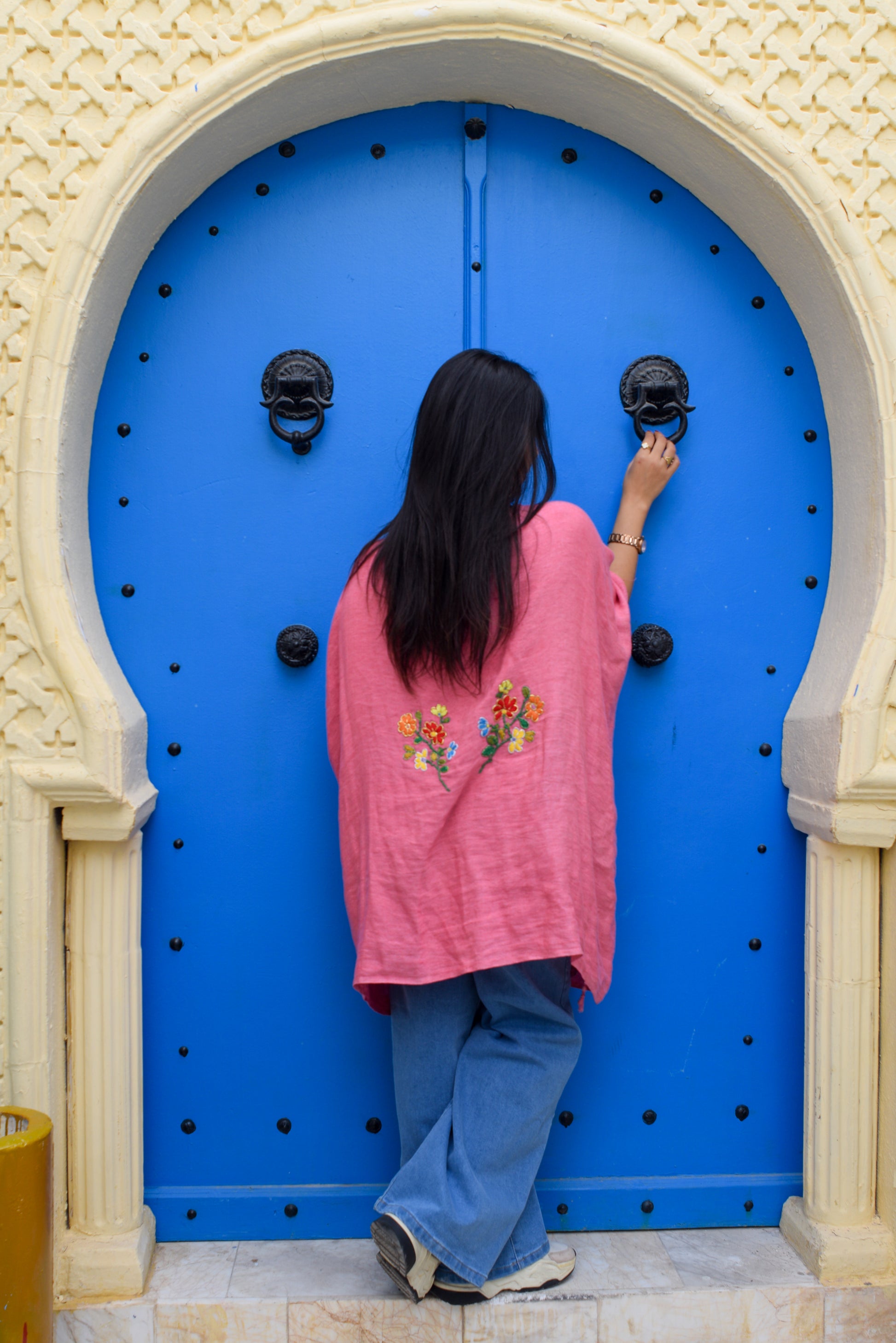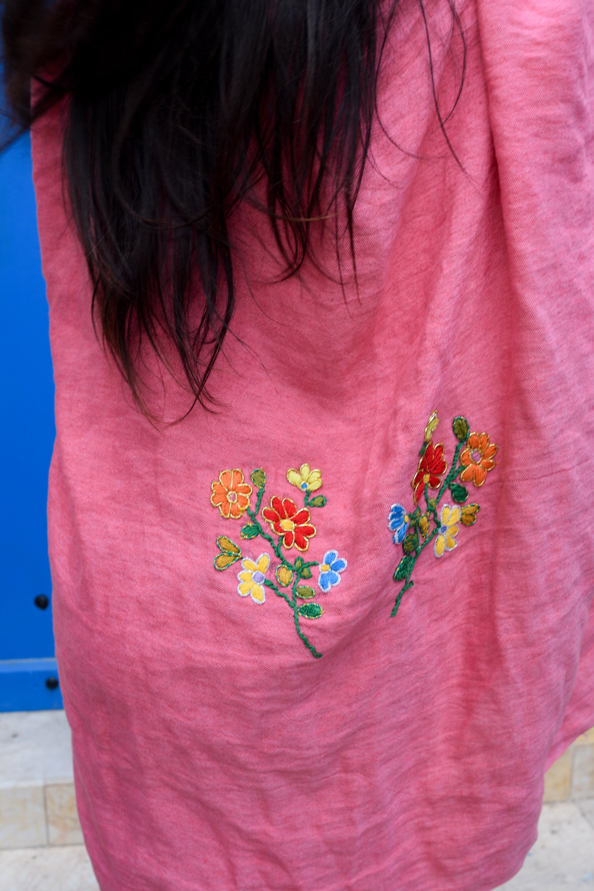 Apportez une touche de charme et de légèreté à votre style avec cette cape rose délicatement brodée à la main.