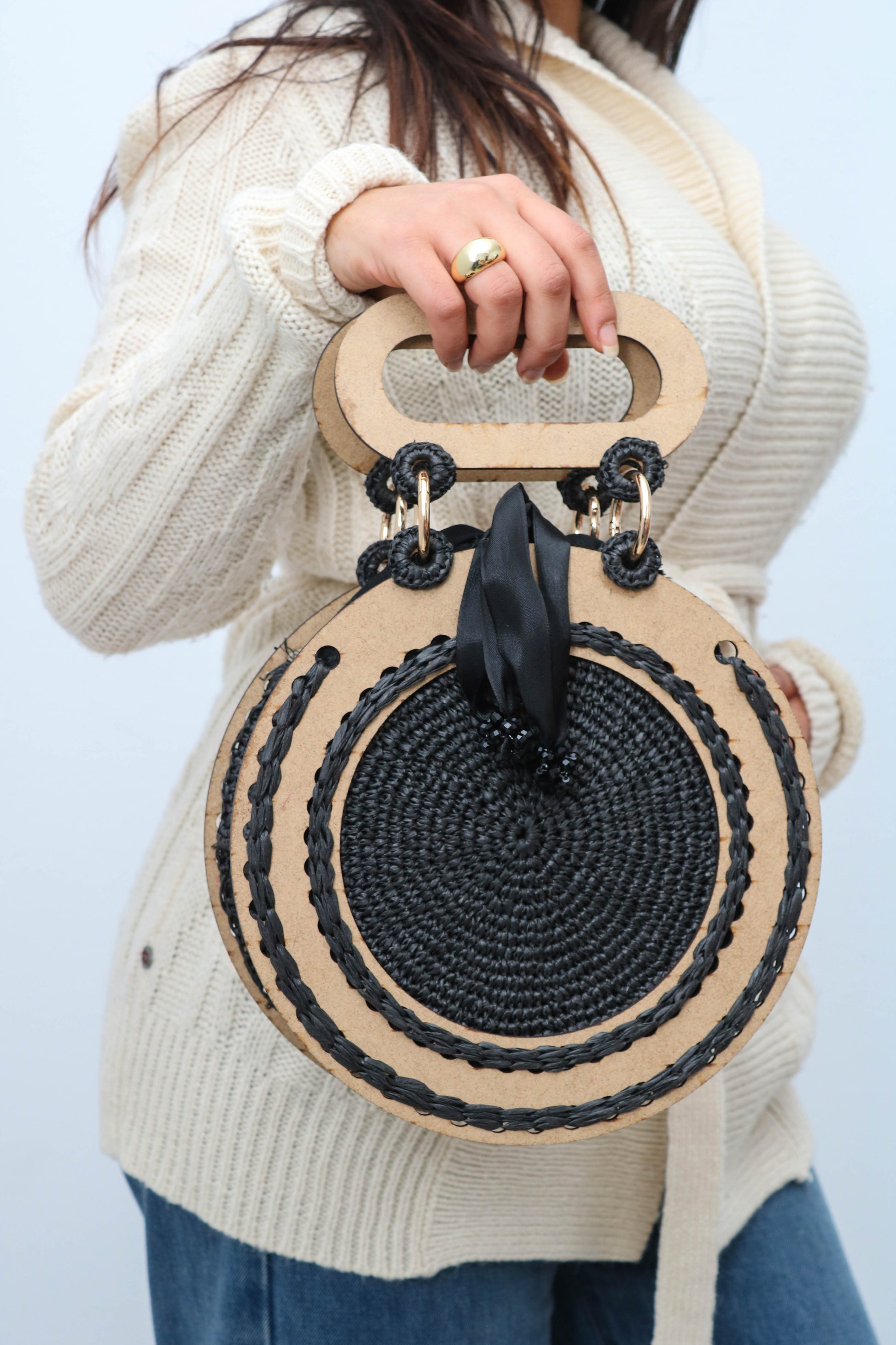 sac à main rond en bois et crochet noir