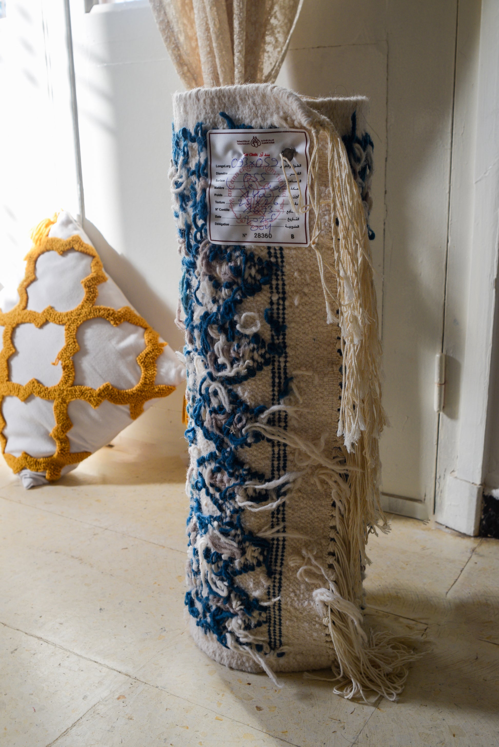 Fabriqué selon un savoir-faire artisanal, il se distingue par ses détails tressés, ses franges traditionnelles et son rendu à la fois authentique et chaleureux.