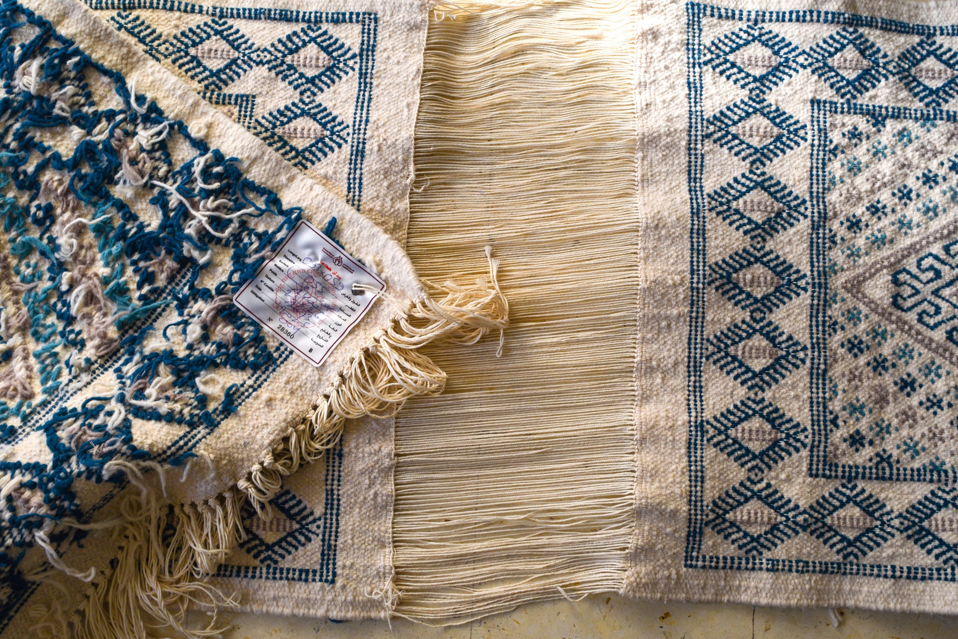 Tapis en Laine Tissé à la Main – Motifs Berbères Bleu et Écru